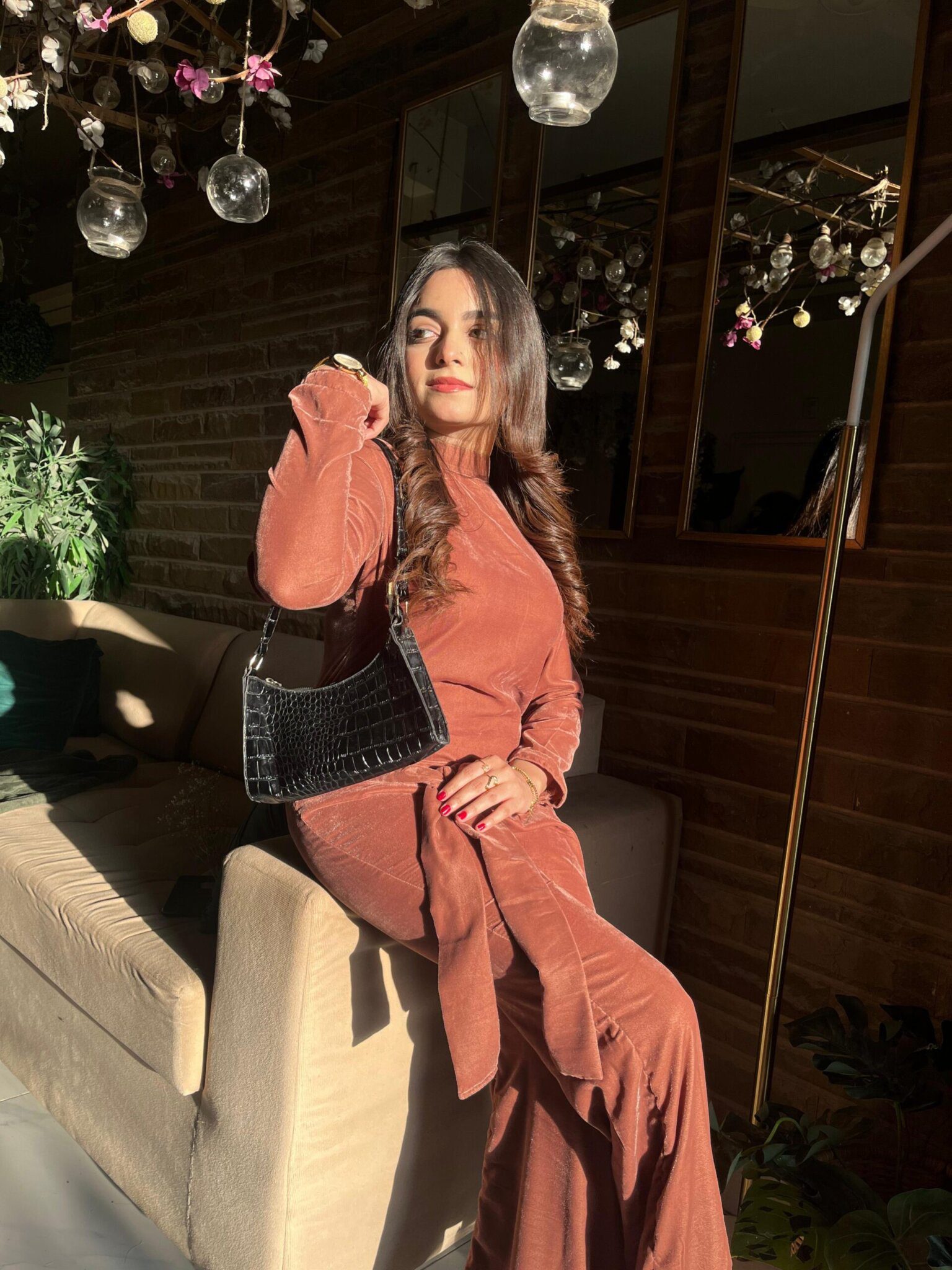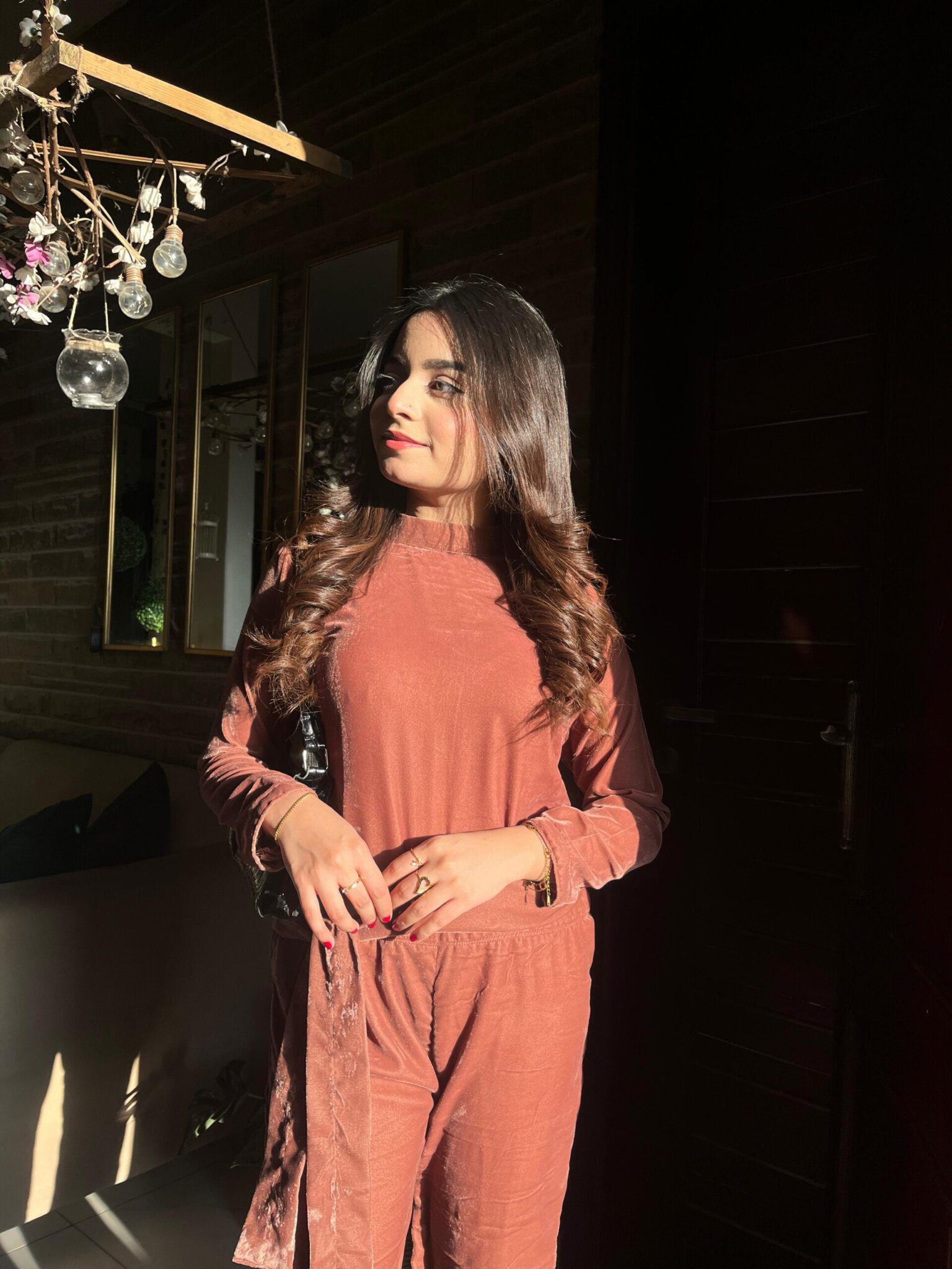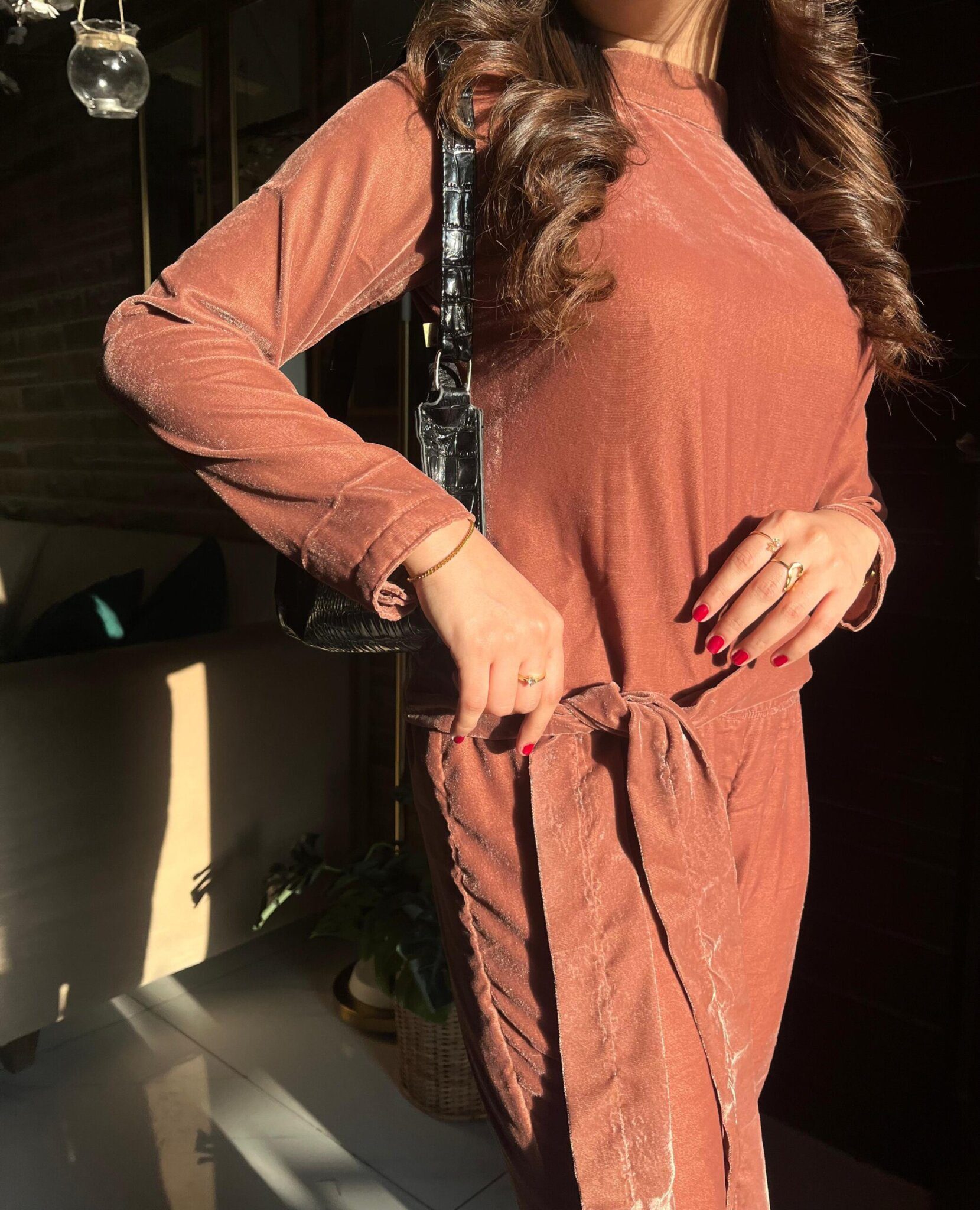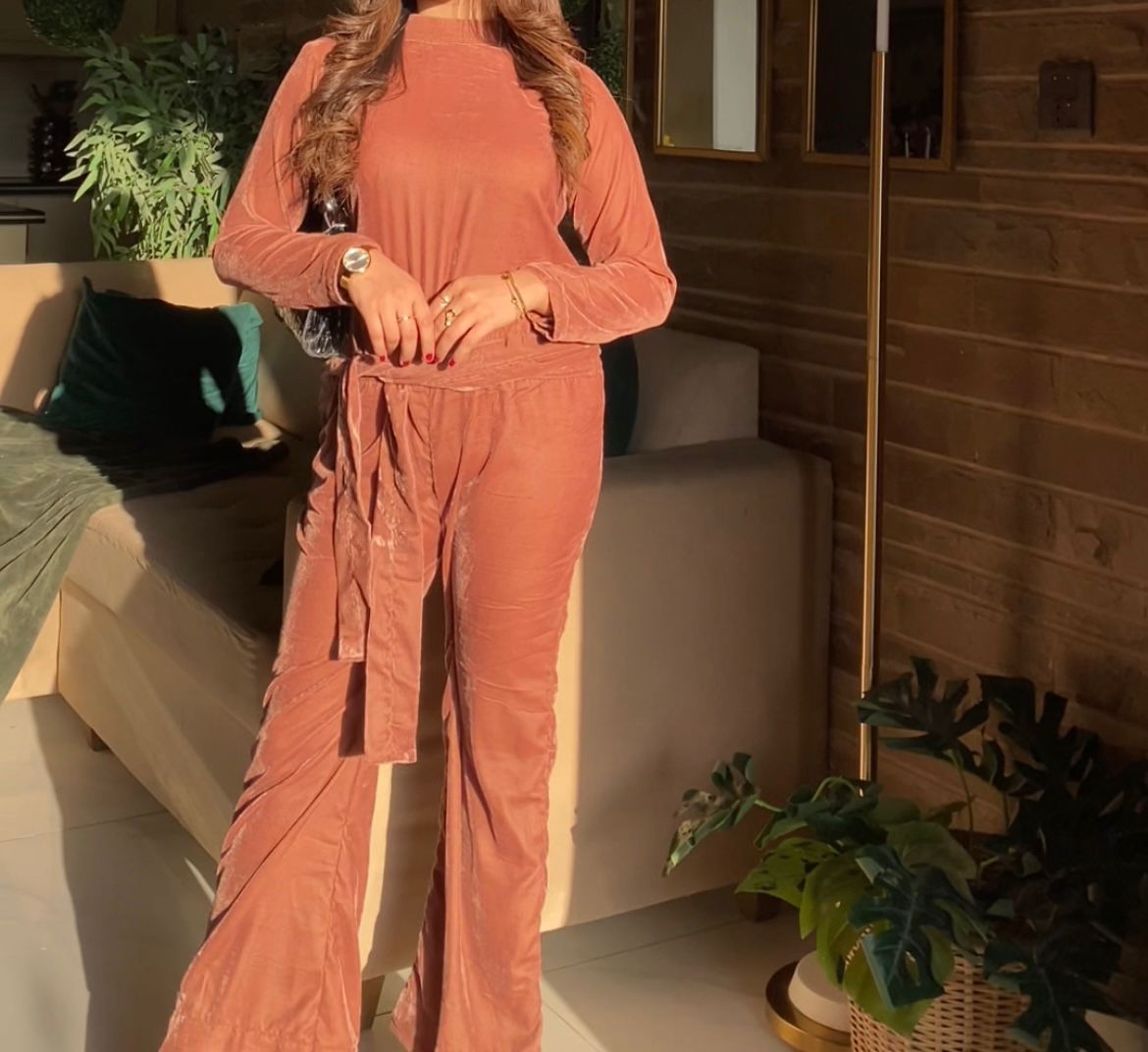 A luxurious pink shade velvet jumpsuit, offering a perfect blend of sophistication and comfort, complete with a velvet belt to adjust the fit for added style and ease.