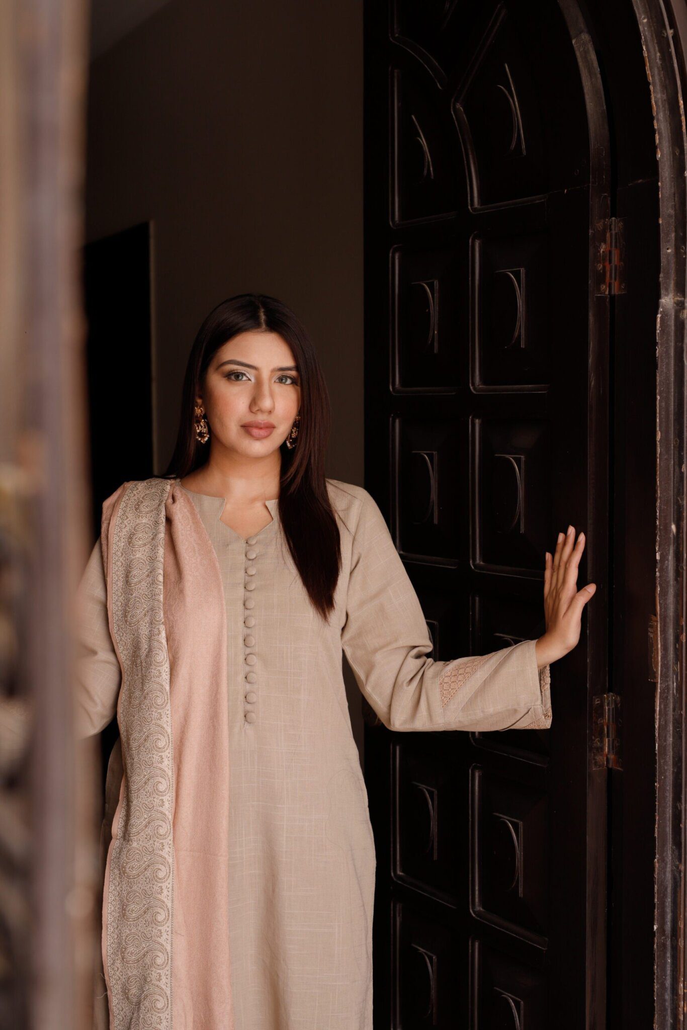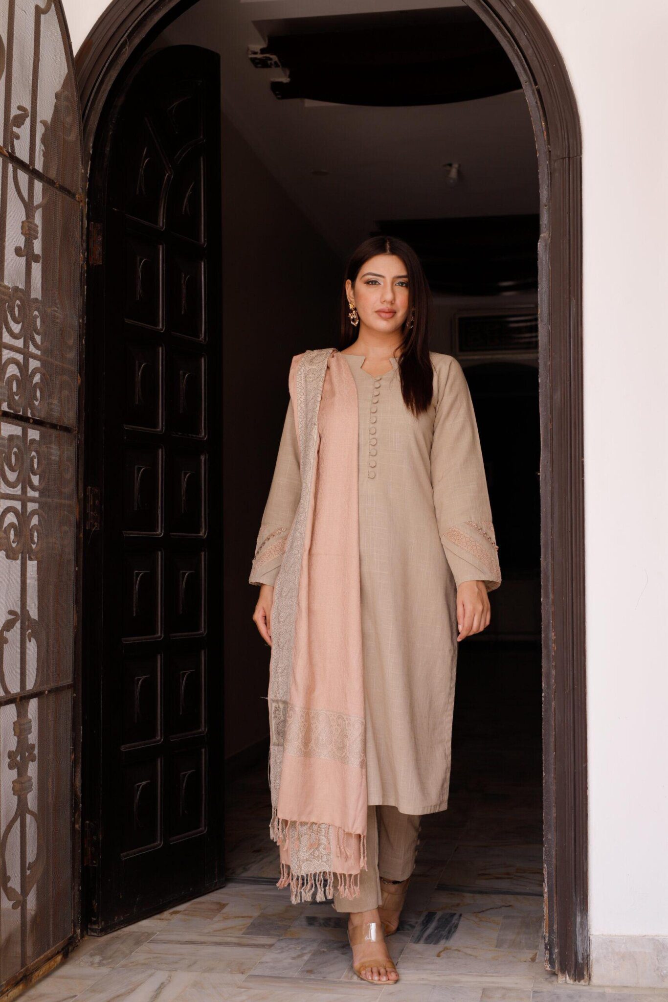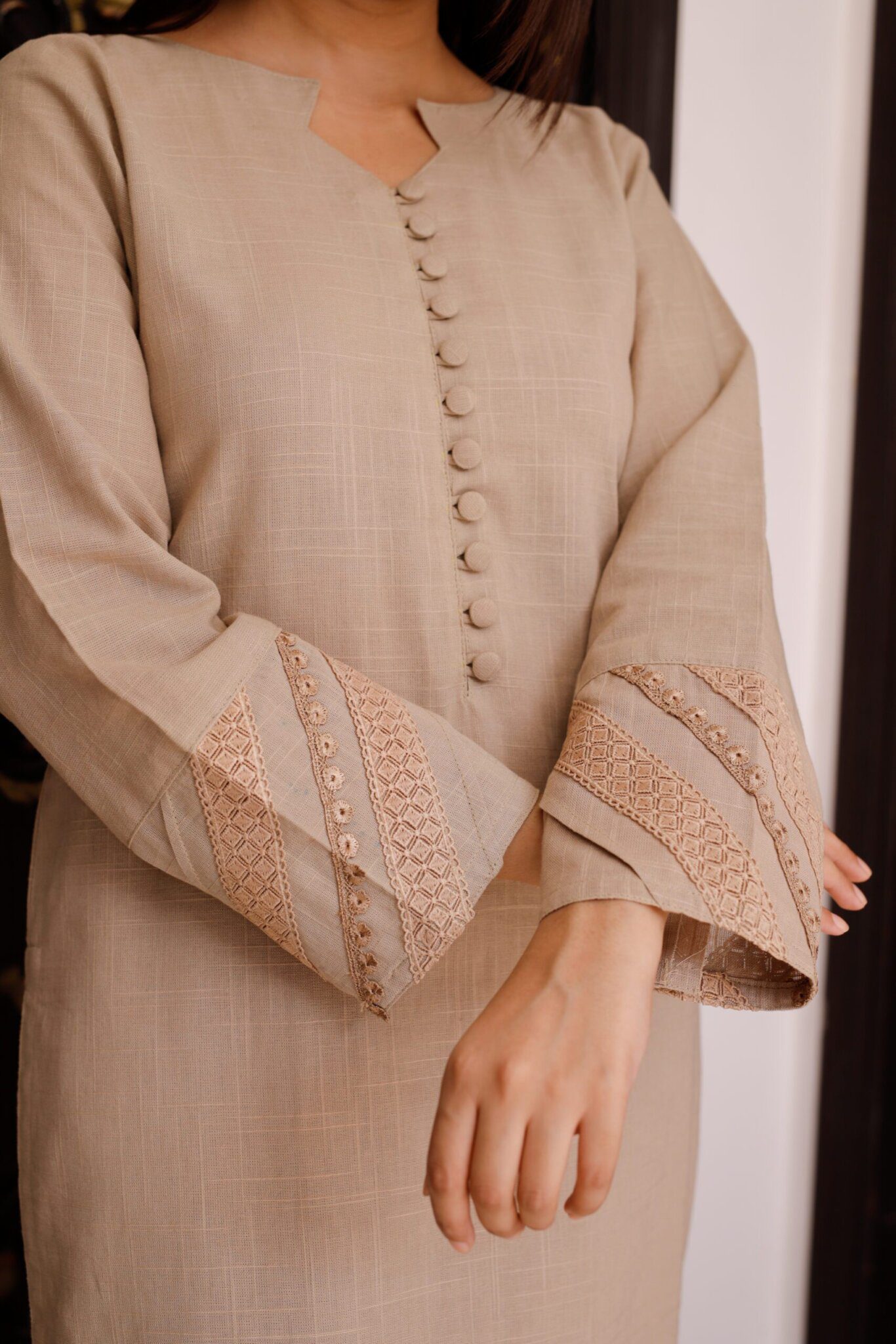 Petaline: Light-colored 3-piece dress set with button embellished long kurti, straight trouser, and lace-adorned sleeves, accompanied by a matching shawl.
