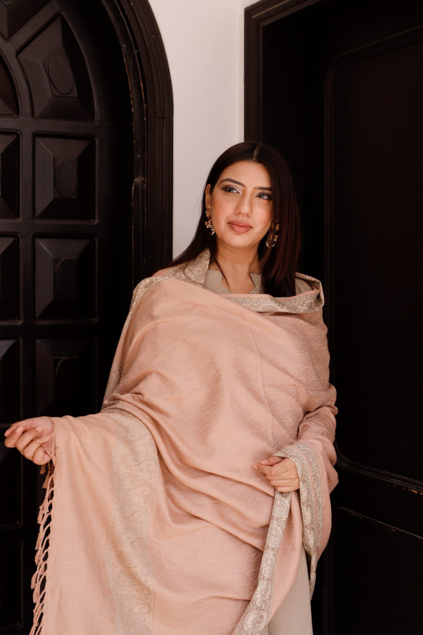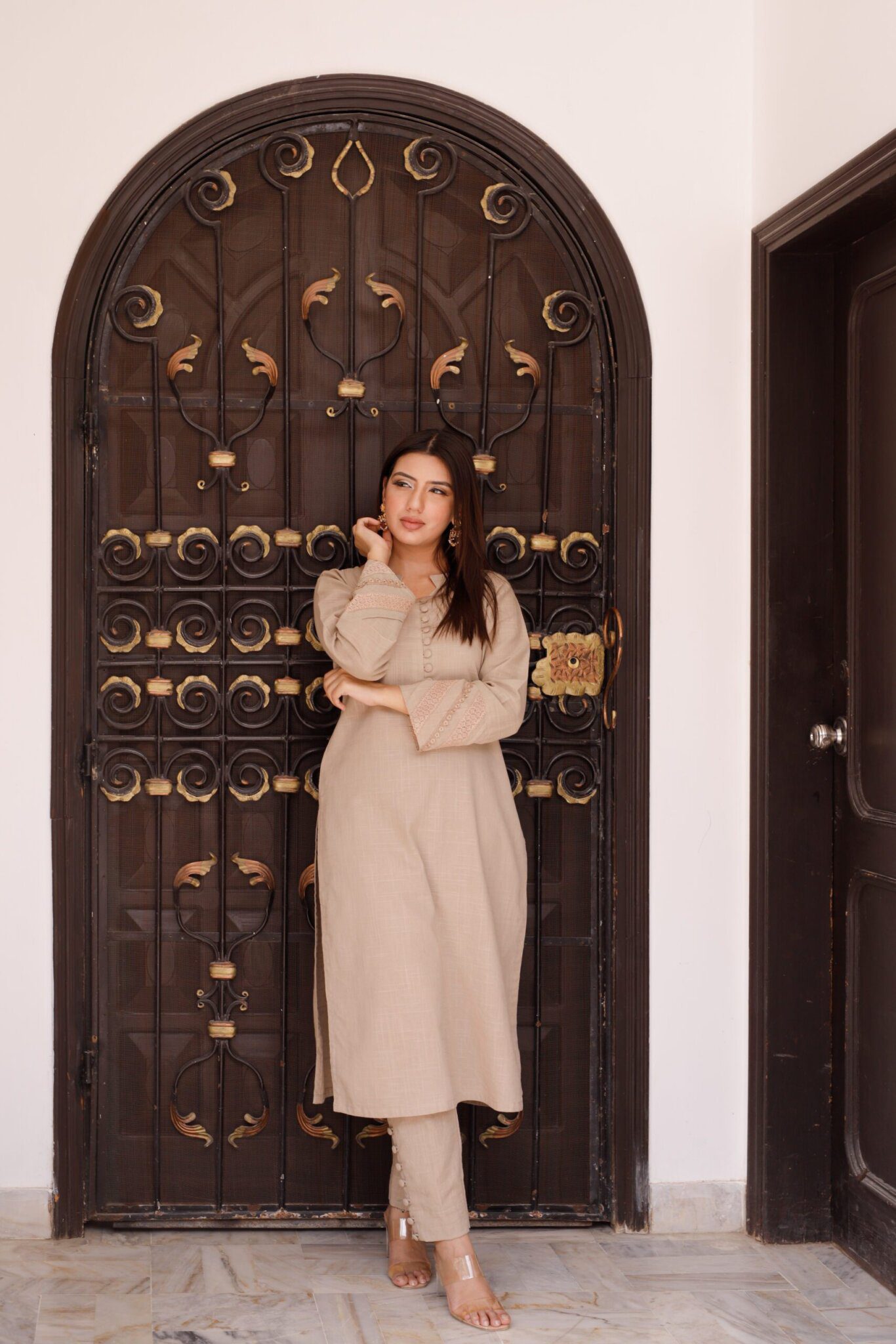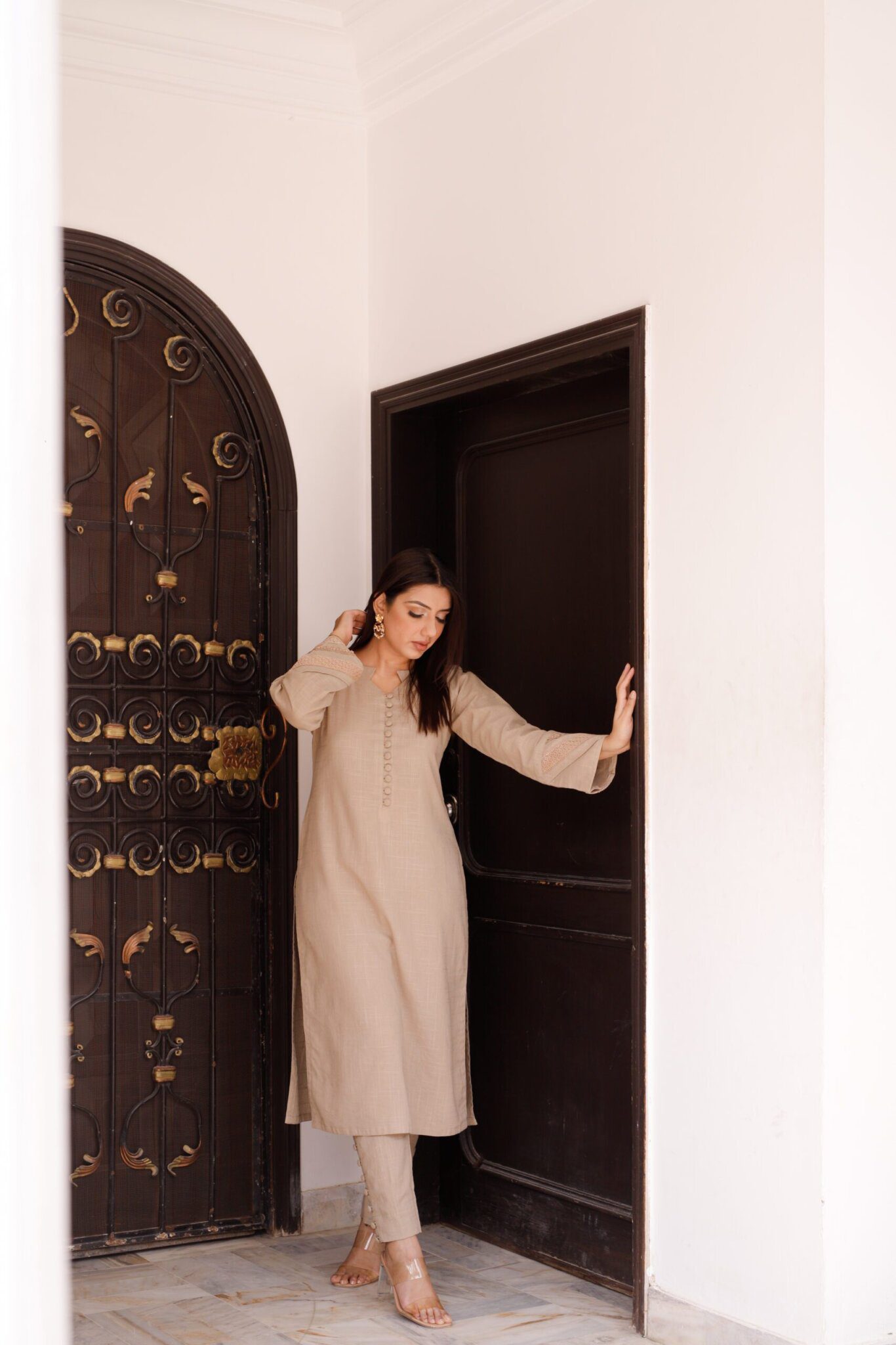 Petaline: Light-colored 3-piece dress set with button embellished long kurti, straight trouser, and lace-adorned sleeves, accompanied by a matching shawl.