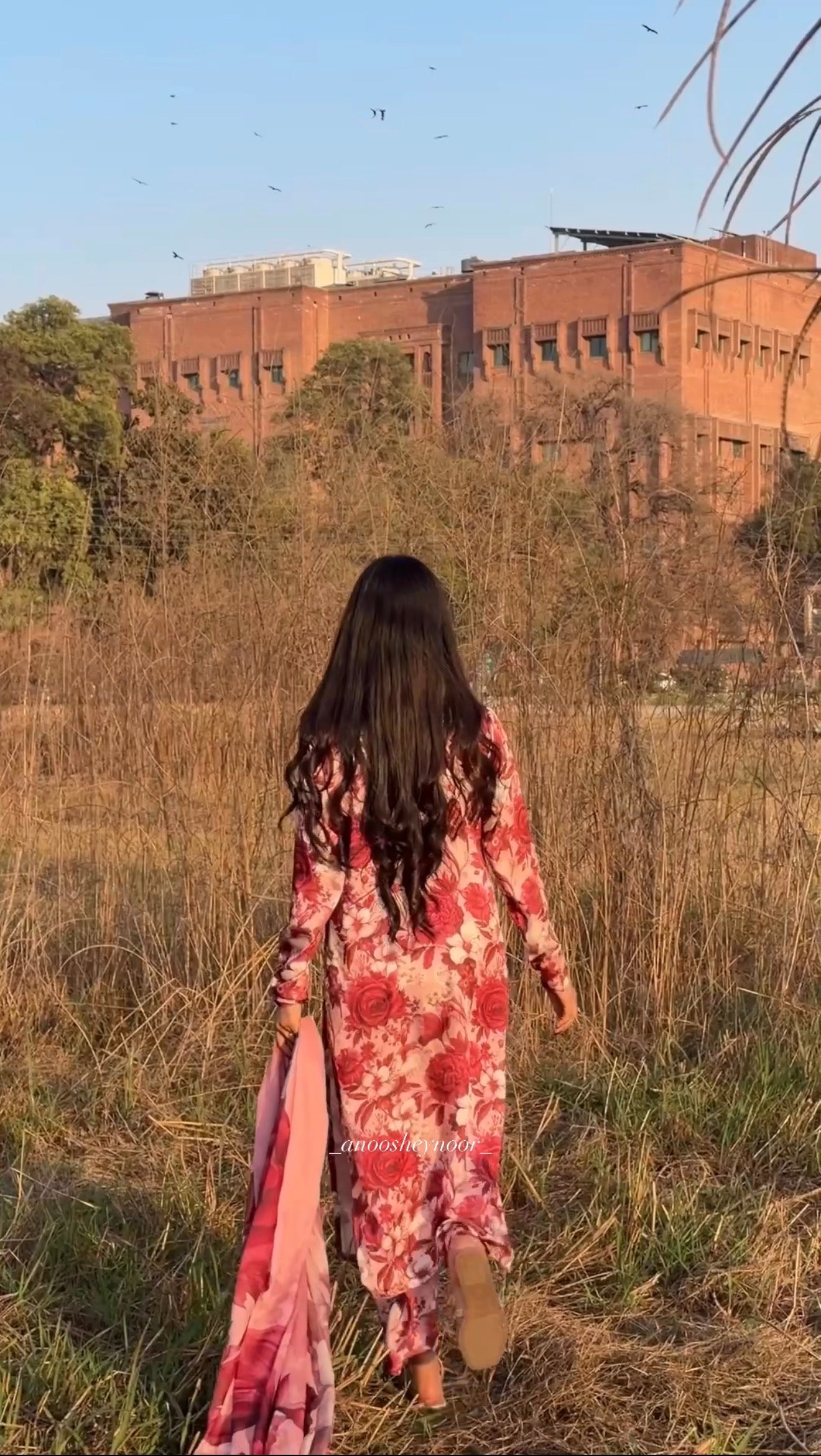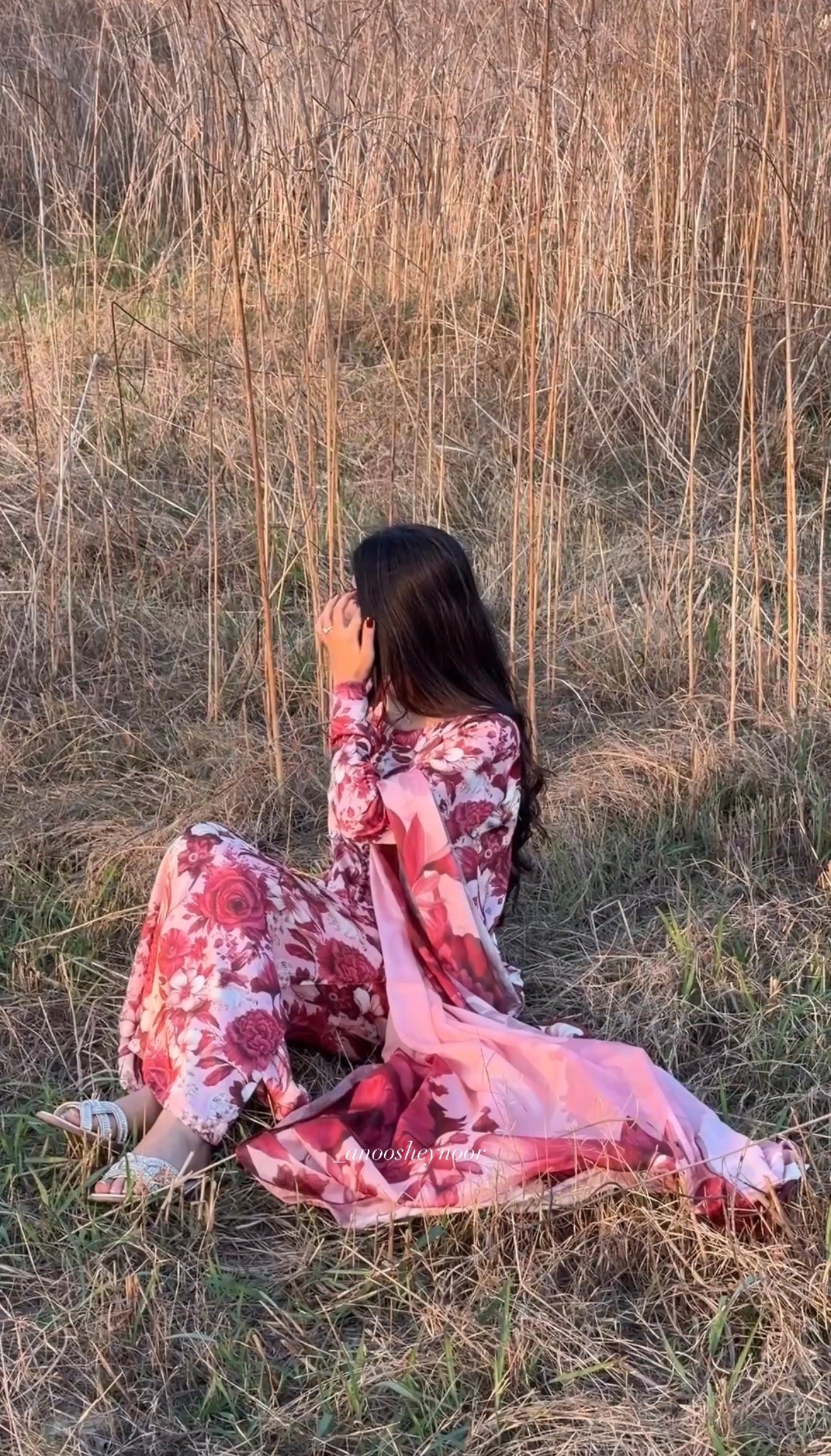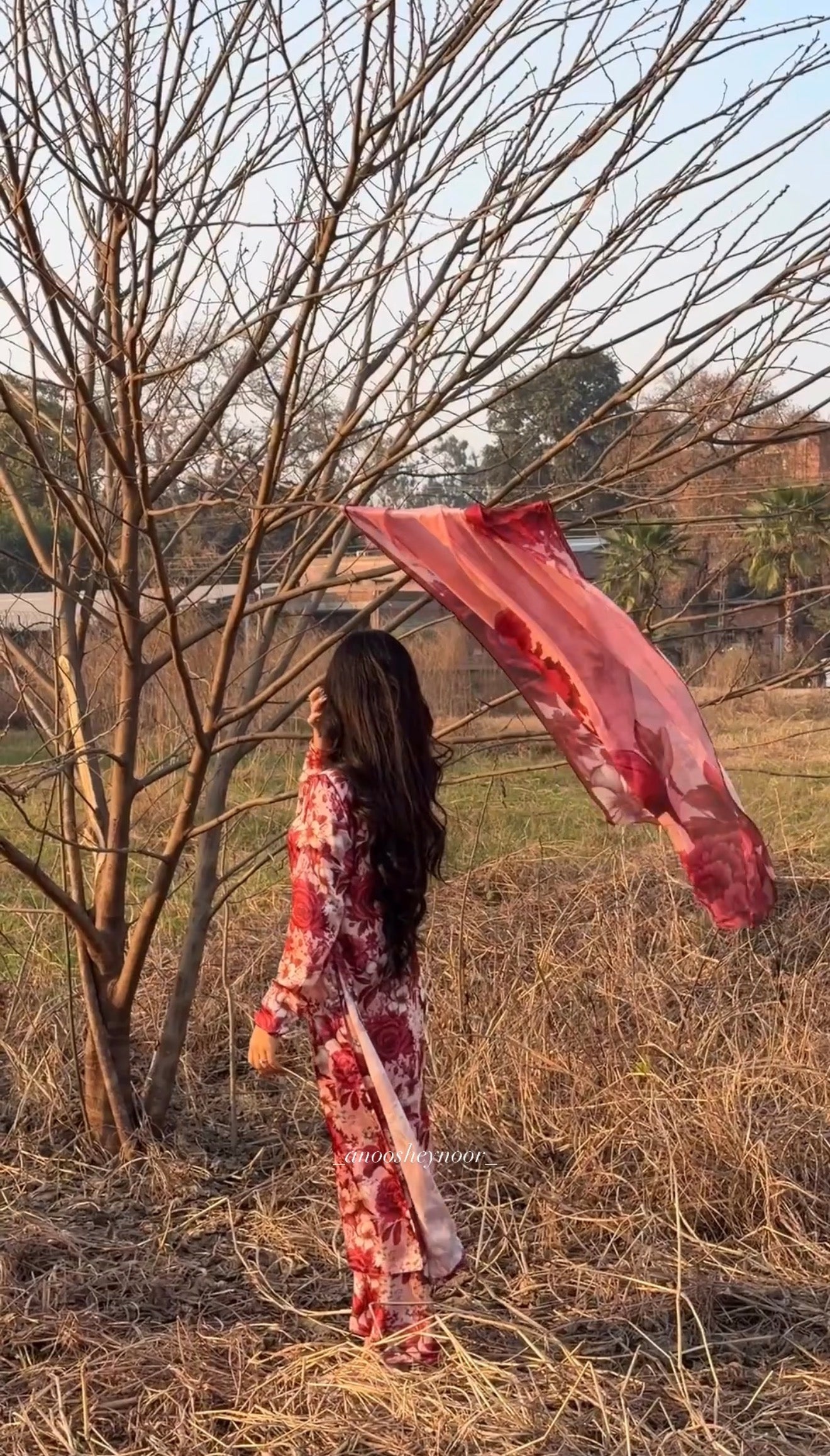 +A captivating red silk outfit blooming with floral prints. The long shirt, palazzo, and dupatta create a luxurious flow, complemented by button accents on the neckline.